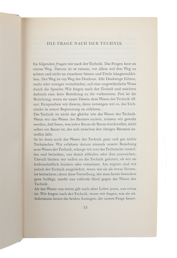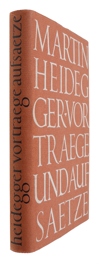 First edition, presentation-copy signed by Heidgger and with an inserted letter, also signed and dated by Heidegger, of this seminal collection of lectures and essays, which was of decisive importance to the immense influence of Heidegger’s thinking upon post World War Europe. This collection of Heidegger’s lectures and essays contains such groundbreaking works as “Die Frage nach der Technik” (The Question Concerning Technology) and “Wissenschaft und Besinnung” (Science and Reflection), “”Dichterisch Wohnet der Mensch…” “, along with other important works written between 1936 and 1953 collected here for the first time. This collection would later be reprinted and serve as volume 7 of Heidegger’s collected works (the Gesamtausgabe). This copy is signed “Martin Heidegger” and dated (1954 – the year of publication) to the front free end-paper, and on the inside of the front board is inserted an autograph signed letter in Heidegger’s hand to “Sehr geehrter Herr Doktor” (honourable doctor), in which Heidegger asks to meet up the following day, suggesting different times of the day. The letter is dated Freiburg 10th of February, 1954, which is two days before Heidegger gave his groundbreaking lecture “The Question Concerning Technology” at the University of Freiburg, suggesting that the letter was given to someone attending the lecture, possibly someone with whom he wanted to discuss it beforehand. “The Question Concerning Technology” still serves as one of the most pertinent philosophical essays of modern time, foreshadowing what is arguably the greatest philosophical and moral dilemmas that we struggle with today due to modern technology. Heidegger begins with asking the question what technology is, in an attempt to fully understand its essence and to ultimately prepare a free relationship to it – a theme that could hardly be more relevant today. “As relevant now as ever before, this accessible collection is an essential landmark in the philosophy of science from one of the most profound thinkers of the twentieth century (New York Times). “Science and Reflection” (here published for the first time), a lecture delivered on August 4, 1953, to a small circle of attendees, is Heidegger’s meditation on the difference between science and “mindfulness”, and an as-relevant-as-ever attempt at uniting science as such, in itself, with its application and meaning, combatting scientific fragmentation. In line with the other foreshadowing lectures, “Dichterisch wohnet der Mensch”, given on October 6, 1951, in Bühlerhöhe, seeks to explore how to reach a peace or dwelling in a modern, technological world. Heidegger uses the quote by Hölderlin to explore how human existence is deeply intertwined with language and poetry and reaches the conclusion that to truly dwell is to live in a poetic way, allowing for the meaningful unfolding of the world through language. The other essays/lectures printed in this seminal volume are: Überwindung der Metaphysik (1936-1946) Was heißt Denken? (1952) Logos (Heraklit, Fragment 50) (1951)