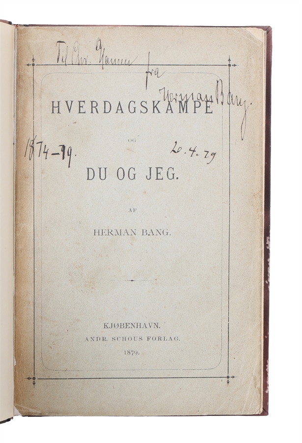 12mo. Indbundet med det originale omslag i et nydeligt nyere halvlæderbind med rygforgyldning. En smule brunplettet. 97,(1) pp. Med dedikation fra Herman Bang på titelbladet: "Til Chr. Hansen / fra / Herman Bang / 20.4.79". Ex-libris påklistret verso af forperm (Poul Sandberg) og verso af foromslag (Rudolf Roussell).