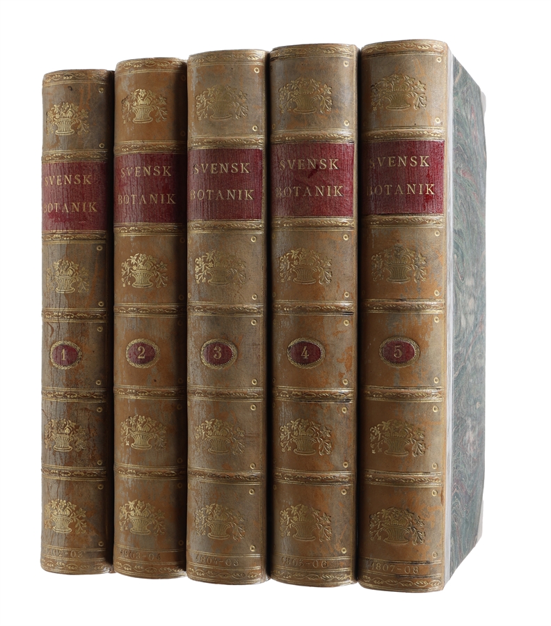Beautiful set of the first edition of the first Swedish colour-plate book on flowers and plants, often characterized as "The Swedish Sowerby". An 11th (and final) volume was planned to appear later, but as a fire in the printing house (in May 1840) destroyed most of the stock of the last published parts before distribution (54 plates in all), this final unfinished and mostly destroyed 11th volume is hardly ever found together with the 10 volumes that were completed. Lindberg, Swedish Books 1280-1967: 55. Nissen: 2223. Stafleu: 2: 7247. Dal, Med kolorerade figurer: pp. 277-83. Dal, Sveriges zoologiska litteratur: p. 118.
