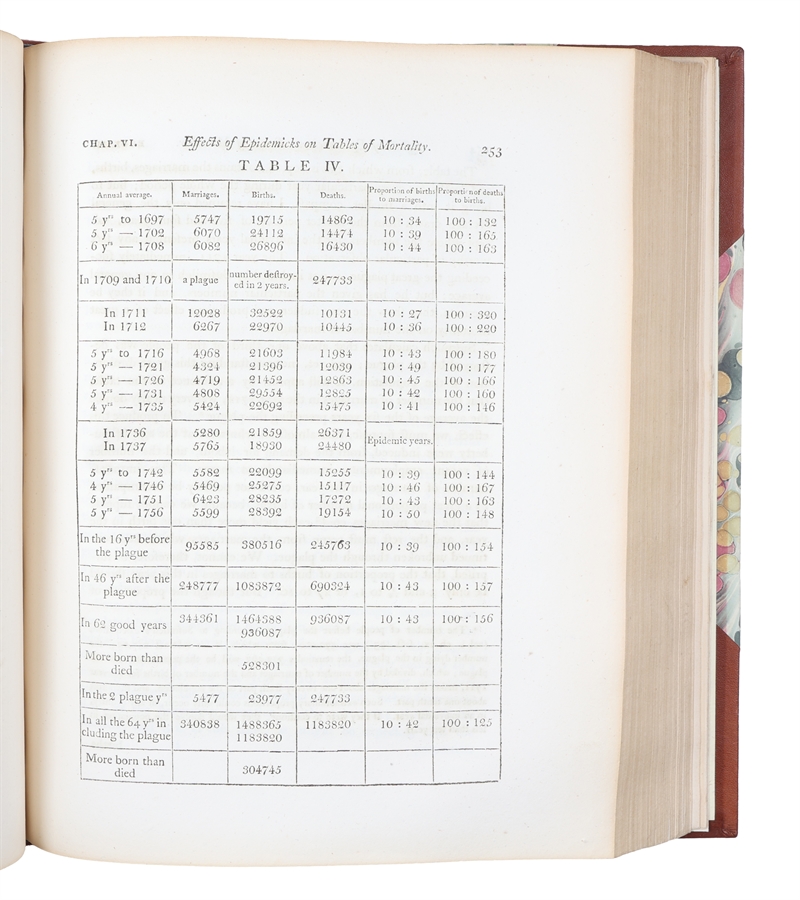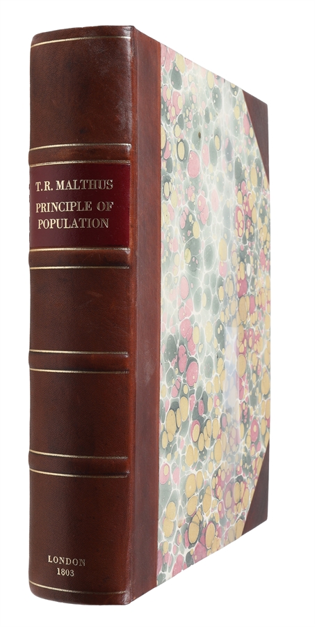 The Great Quarto-edition of Malthus' milestone work, the first and most influential book on population. Although being the second edition, after the anonymously printed first of 1798, it is so significantly altered, revised, and expanded that it is considered a new work rather than a new edition. Malthus himself also thought of it as such. It is nearly four times the length of the 1798 essay, the title has been changed (the title of the first: "An Essay on the Principle of Population, as it Affects the Future Improvement of Society with Remarks on the Speculation of Mr. Godwin, M. Condorcet, and Other Writers"), and it is published with Mathus' name as the author, not anonymously. All later editions were minor revisions of this heavily expanded and altered second one. "In the course of this inquiry, I found that much more had been done, than I had been aware of, when I first published the essay. The poverty and misery arising from a too rapid increase of population, had been distinctly seen, and the most violent remedies proposed, so long ago as the times of Plato and Aristotle. And of late years, the subject had been treated in such a manner, by some of the French economists, occasionally by Montesquieu, and, among our own writers, by Dr. Franklin, Sir James Steuart, Mr. Arthur Young, and Mr. Townsend, as to create a natural surprise, that it had not excited more of the publick attention" (Preface to the second edition, p. IV). The controversial views, because of which the work became so influential, are most provocative and eyeopening in the second edition, in which Malthus for instance for the first time advocates moral restraint (meaning sexual abstinence and late marriage) and elaborately explains his comparison between the increase of population and food. "The "Essay" was highly influential in the progress of thought in the early nineteenth-century Europe.... "Parson" Malthus, as Cobbett dubbed him, was for many, a monster and his views were often grossly misinterpreted... But his influence on social policy, whether for good or evil, was considerable. The Malthusian theory of population came at the right time to harden the existing feeling against the Poor Laws and Malthus was a leading spirit behind the Poor Law Amendment Act of 1834." (PMM 251). Thomas Robert Malthus (1766-1834), called the "enfant terrible" of the economists, was an English demographer, statistician and political economist, who is best known for his groundbreaking views on population growth, presented in his "Essays on the Principle of Population", which is based on his own prediction that population would outrun food supply, causing poverty and starvation. Among other things this caused the legislation, which lowered the population of the poor in England. Malthus actually turned political, economic, and social thought upside down with this work, which has caused him to be considered one of the 100 most influential persons in history (Hart, The 100: A Ranking of the most Influential Persons in History, 1978). Malthus was, naturally, condemned by Marx and Engels, and opposed by the socialists universally, but the work had an enormous impact on not only politics, economics, and social sciences, but also on natural sciences. For instance, both Darwin and Wallace considered Malthus a main source in their development of the theory of natural selection, considering him a great philosopher and his Essay on Population one of the most important books ever. "Malthus’s idea of man’s "Struggle for existence" had decisive influence on Charles Darwin and the theory of evolution. Other scientists related this idea to plants and animals which helped to define a piece of the evolutionary puzzle. This struggle for existence of all creatures is the catalyst by which natural selection produces the "survival of the fittest"... Thanks to Malthus, Darwin recognised the significance of intraspecies competition between populations of the same species (e.g. the lamb and the lamb), not just interspecies competition between species (e.g. the lion and the lamb). Malthusian population thinking also explained how an incipient species could become a full-blown species in a very short timeframe." The second edition must be considered the most important of all the editions. This is far more a work on the problems of over-population than it is a response to Godwin and Condorcet on their works (whic is the main concern of the first edition). "Not so much shocked by his own conclusions, in his "Essay on Population" (first ed. 1798), as driven by a naturally inquiring mind, he travelled for three years through Europe gleaning statistics and then published a second edition (1803)." (Catlin, A History of the Political Philosophers, 1939, p. 377). PMM 251 (first edition).