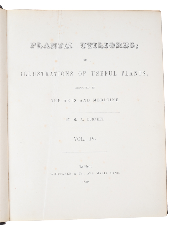 First and only edition of this beautiful book of medicinal plants, with 260 magnificent plates my Miss M. A. Burnett in stunning hand-colouring. Mary Ann Burnett was one of the foremost femaile Victorian-era botanists, as well as author, and illustrator. She is primarily famous for her stunning botanical artwork, most natable of which is the grand four-volume Plantae Utiliores. The 260 plates in this wonderful work are known for their scientific precision as well as their beauty and vibrant colours. This Victorian-era work of medicinal plants with its scientific descriptions and accounts of the medicinal and culinary uses of the plants brings to mind the herbals of preceding centuries, but has a rare artistic appeal - and is the work of a female artist and scientist. Part of the text is by botanist Gilbert Thomas Burnett, Miss Burnett's brother. The work is rarely found in coplete state as here. Nissen; 305; Pritzel 1400. "Most of the text was drawn from notes left by Miss Burnett's brother G.T.B." (The Library of the Stiftung fur Botanik, Liechtenstein. Sotheby's Sales Catalogue. 1975. No. 118). Sitwell: p. 83.