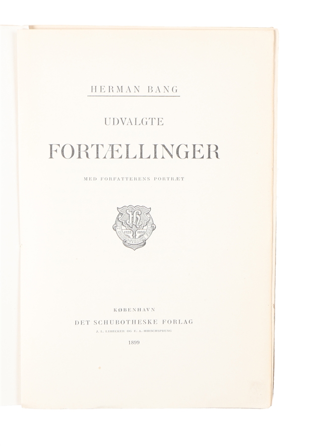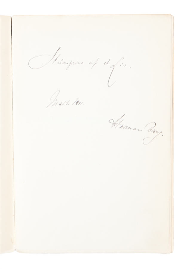 8vo. Åbeskåret, uåbnet, i de originale omslag Med egenhændig dedikation fra Bang på fribladet: "Stumperne af et Liv. / Marts 1901 / Herman Bang." Ryg med slitage, et ellers nydeligt og meget velbevaret eksemplar. (12),412,(4) pp. + frontispieceportræt.