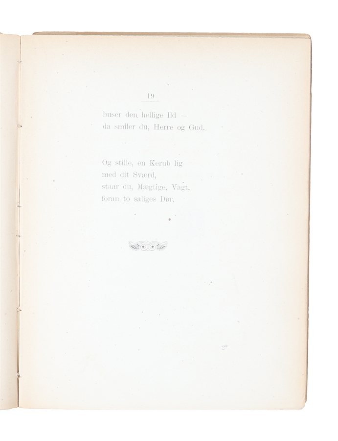 8vo. I det originale forlagsbind med forgyldt titel på forperm. Ryggen defekt, begge permer løse. Med egenhændig dedikation fra Bang på titelblad: "Et Minde om tunge Timer - / til en Ven, der ved, hvorom Bogen handler. / Herman Bang." (4), 118, (2) pp.