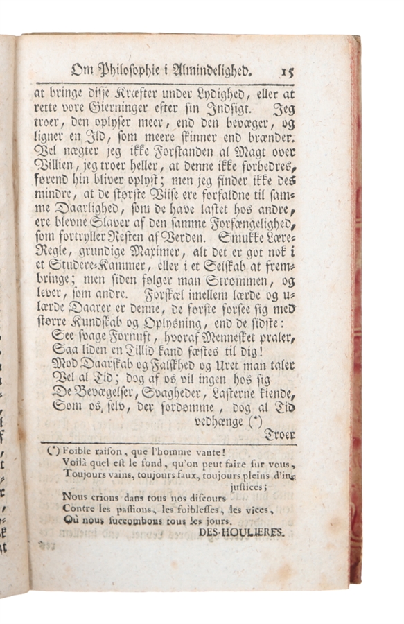 Den sjældne originaludgave, hvori Eilschov introducerede den Wolffske filosofi for kvinder. "Bogen udkom i tre hæfter. På titelbladet står der "1. Deel" men fortsættelsen udkom aldrig, måske fordi han døde af kopper i efteråret 1750. Bogen giver udtryk for væsentlige sider af Fr. Chr Eilschovs (1725-50) tænkning. Han introducerede heri på dansk den Wolffske filosofi for Kvinder. Eilschov følte sig stærkt tiltrykket af den Leibniz-Wilffske rationalistiske filosofi, og på mange punkter gav han den sin tilslutning, man han ønskede dog ikke at blive betragtet som Wolffianer - "Jeg kand derfore ikke taale at nogen skælder mig Wolffianer. Thi jeg har ikke forpagtet mig bort til nogen."" (Danske bogsamlere udstiller...2). Udstillet som nr. 41 på Dansk bibliofil-klubs 60 års jubilæumsudstilling.