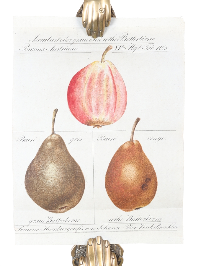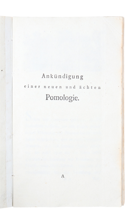 Very rare prospectus "announcing a new pomology that was to be entitled Pomona Hamburgensis by Johann Peter Buek. Buek's work was never published but he came from a prominent family who had a flower, seed, and landscape business in Hamburg. The last leaf is signed "Johann Peter Buek, Peters Sohn, Blumen - Saamen - und baumha¨ndler. Wohnhaft auf der grossen Dreybahn in Hamburg." (Oak Spring Garden Library) OCLC only list one copy (Oak Spring Garden Library)