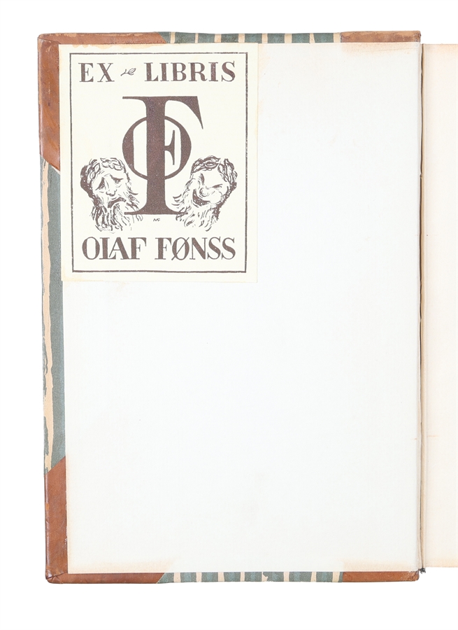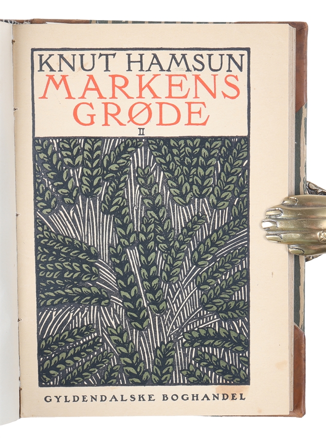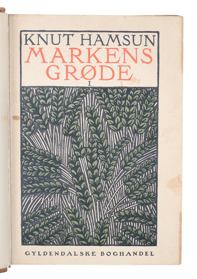 A magnificent copy of the first edition of Hamsun’s mature magnum opus “Growth of the Soil” - one of the greatest classics of the 20th century and the work that earned Hamsun the Nobel Prize (1920) - the great actor Olaf Fønss’ copy, with a handwritten visiting card from Hamsun to Olaf Fønns. The handwritten text (in Norwegian) on the card reads “Hr. Olaf Fønss, Tusen Tak for / Boken! Igjen like viril! Graanet, erfaren, / kanske ogsaa slitt paa, men like lys og like / ukuet. / Med Hilsen fra min Kone og / Deres / Knut Hamsun. / Nørholm, 27/10 31.” (I.e. Mr. Olaf Fønss / a thousand thank yous / for the book! Again, just as virile! Greying, experienced, / perhaps also worn, but just as bright and just as / indomitable / With greetings from my wife and / your / Knut Hamsun / Nørholm, 27/10. 31.” Olaf Holger Axel Fønss (1882-1949) was one of the greatest actors of the era, one of the biggest silent film stars of Denmark and Germany. Apart from being an actor and a top matinee idol, he was also a writer, director, producer, and film censor. Although we have not been able to determine it for sure, it is very likely that Fønns will have played Hamsun characters on the stage at some point, perhaps also Isak Sellenrå, the main character of “Growth of the Soils”. At least, the present copy of the work would suggest so. “Growth of the Soil” is one of the greatest novels of the 20th century, and it profoundly shaped the way of modern literature. It is widely regarded as one of the best books of the 20th century. Thomas Mann called it ”a wonderful, extraordinary book”; Heminway wrote about the book, from Switzerland, to Fitzgerald in Paris, recommending him to read is, as it was so good; André Gide (as many others before and after) compared Hamsun to Dostojevsky, but commented that he was more refined; Singer was hypnotized by him; Knausgård considers the work hypnotizing; Kafka was utterly fascinated, H.G. Wells was thoroughly impressed and called it one of the best novels he had ever read, describing it as beautiful through and through, etc., etc. “One of the most important and controversial writers of the 20th century... Hamsun influenced many of the major 20th-century writers who followed him, including Kafka, Joyce and Henry Miller." (George Egerton). Hamsun is considered "one of the most influential and innovative literary stylists of the past hundred years" (i.e. 1890–1990) (Robert Ferguson). He pioneered psychological literature with techniques of stream of consciousness and interior monologue, and influenced authors such as Thomas Mann, Franz Kafka, Maxim Gorky, Stefan Zweig, Henry Miller, Hermann Hesse, John Fante, James Kelman, Charles Bukowski, and Ernest Hemingway. Isaac Bashevis Singer called Hamsun "the father of the modern school of literature in his every aspect—his subjectiveness, his fragmentariness, his use of flashbacks, his lyricism. The whole modern school of fiction in the twentieth century stems from Hamsun". “When it was first published in 1917, Growth of the Soil was immediately recognized as a masterpiece. Ninety years later it remains a transporting literary experience. In the story of Isak, who leaves his village to clear a homestead and raise a family amid the untilled tracts of the Norwegian back country, Knut Hamsun evokes the elemental bond between humans and the land... Hamsun’s novel is a work of preternatural calm, stern beauty, and biblical power—and the crowning achievement of one of the greatest writers of the twentieth century.” (Penguin Classics).