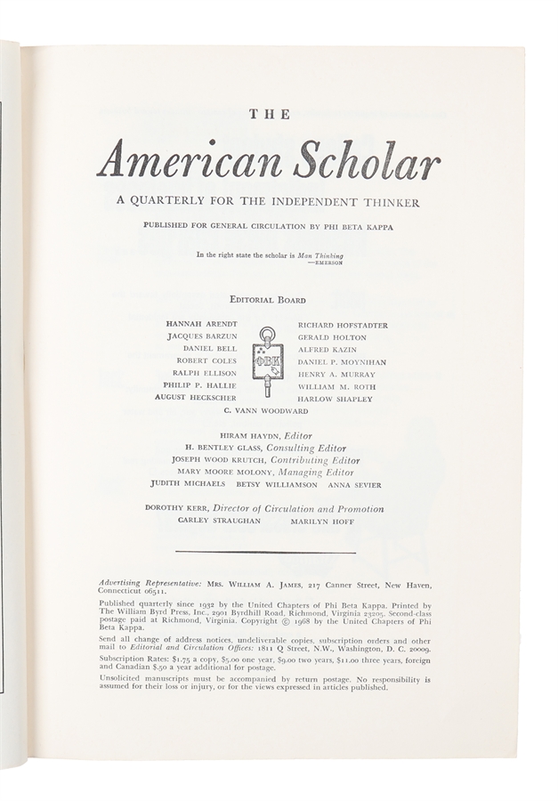 8vo. Entire issue of The American Scholar in the original printed wrappers. A slight bump to upper spine, otherwise exceptionally fresh, clean, and bright. Internally near mint. Wheeler: pp. 248-274. With an illustration of a black hole and diagrams in the text. [Entire volume: (17) pp. + pp. 210-378).