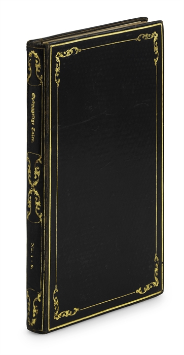 8vo. 52 pp. + 62 pp. + 84 pp. All three publications bound together in an absolutely magnificent full black fine morocco binding with richly gilt ornamental spine with gilt Gothic lettering: Opbyggelige Taler. No. 1-9. White moiré-endpapers. Boards with a single gilt line-frame inside which another gilt frame with ornamental corners. Edges of boards and inner dentelles with gilt single line-ornamentation. All edges gilt. A truly magnificent binding with just minimal wear and no restorations of any kind. Printed on varying paper, one quire being thinner than the rest. Some browning and light brownspotting. Old owner’s names to front fly-leaf and previous owner’s neat pencil annotations to front and back free end-papers, explaining that this is Kierkegaard’s own, personal copy, and the further provenance of it.