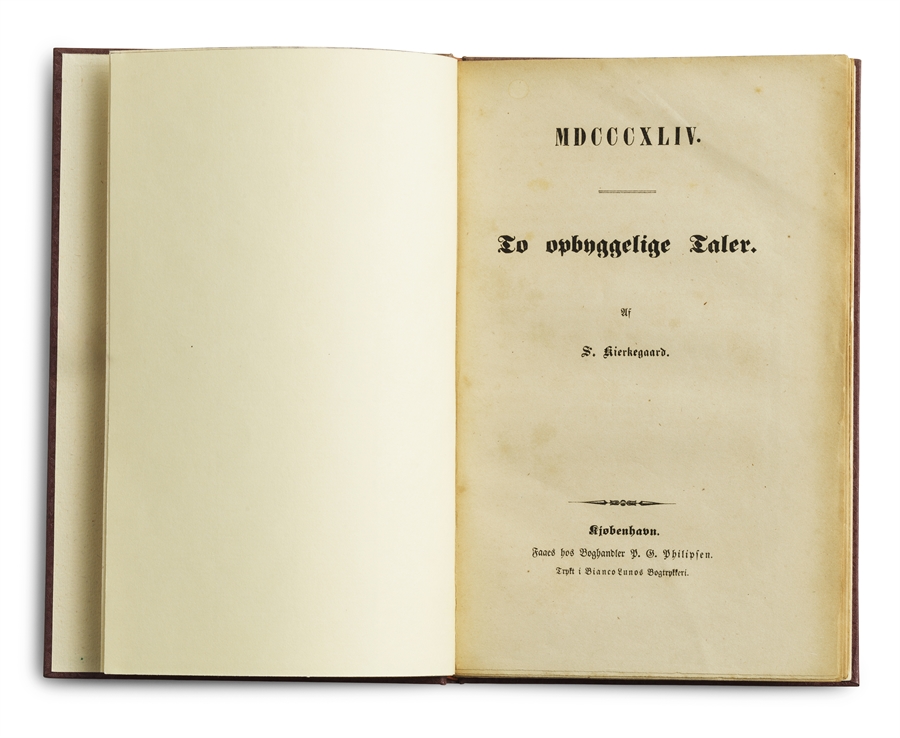 A beautiful copy of the Two upbuilding Discourses from 1844 with the incredibly scarce blank leaf between the title-page and the preface preserved. A significant typographical anomaly is present in the Two Upbuilding Discourses of 1844. In that, Kierkegaard had a blank leaf inserted between the title-page and the preface. This blank leaf is almost always missing in bound copies of the publication – even in the two known presentation-copies. But it is actually quite important and bears witness to the fact that when it comes to In the preface to Two Upbuilding Discourses from 1844, Kierkegaard writes that “Even though this little book […] has omitted something, it has forgotten nothing.” That which has been omitted Kierkegaard's Upbuilding (or Edifying) Discourses were published over the course of two years, in 1843 and 1844. In all, 18 Upbuilding Discourses were published, divided over six publications, namely: Two Upbuilding Discourses from 1843, Three Upbuilding Discourses from 1843, Four Upbuilding Discourses from 1843, Two Upbuilding Discourses from 1844, Three Upbuilding Discourses from 1844, Four Upbuilding Discourses from 1844. Each of these publications accompanied one of the main pseudonymous works, beginning with Either-Or in 1843. As opposed to his major philosophical works, the religious upbuilding discourses actually bear the name of the author on the title-page. Of course, this was by no means incidental. While the pseudonymous works could raise the question of the religiousness of the author, the parallelly written religious discourses stress the fact that we are dealing with an author, who was religious from the very beginning – an essential fact that Kierkegaard wished to stress for those interested in his authorship. In his journals, Kierkegaard clearly states that the religious discourses are as significant in his oeuvre as a whole as are the larger pseudonymous works, “I began with “Either-Or” and two upbuilding discourses...” he says, and explains that he intended the upbuilding, the religious, to advance, and that he wanted to show “that the writer was not an aesthetic author who in the course of time grew older and for that reason became religious”. (Journals, IX A 227). He was religious all along, also during all of the major philosophical publications that were not written in his name. The fact that every major pseudonymous work – up until Concluding Unscientific Postscript appeared and revealed the identity of the real author – was accompanied by one of these small Upbuilding Discourses, bears testament to the pivotal role they play in Kierkegaard’s philosophical development. Furthermore, while Kierkegaard could not present anyone with copies of his pseudonymous works (as his name did not appear as the author on the title-page), he could indeed give away presentation-copies of his accompanying Upbuilding Discourses, which he then did. Himmelstrup: 60.